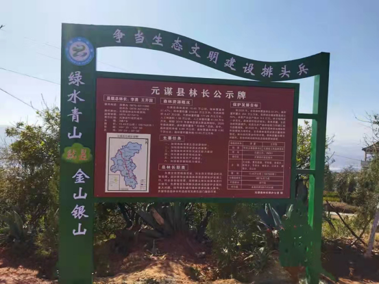 建立健全社会参与的监督体系。设置林长制公示牌。向社会建立各级林长责任区公示牌,对各级林长各自责任区域内森林草原资源保护发展工作开展责任宣誓,主动接受全社会监督。全县已在县境内重点出入口和人流量比较大的老城乡、江边乡、元马镇的显著位置、交通要道、重要观景点竖立了县级林长公示牌3块,以图文表方式对元谋县的区域范围、森林资源概况、主要任务、总林长职责、保护发展目标等基本信息向社会公示,力争在全县范围内推进村(社区)林长制公示牌全覆盖,让每一片绿地都有属于自己的“名片”。