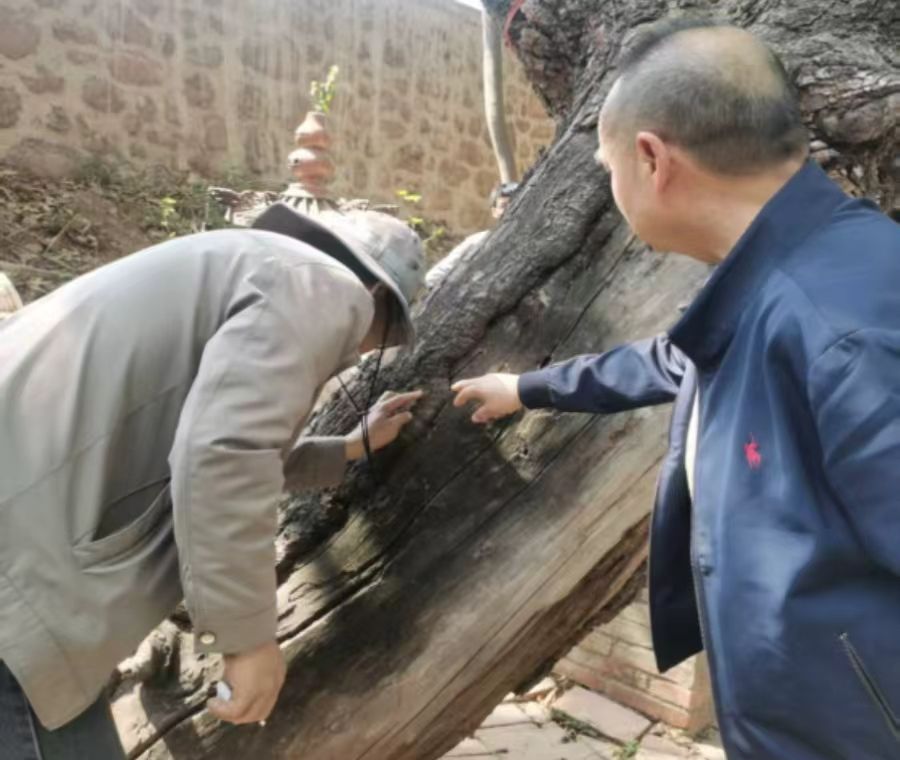 元谋县林草局在工作开展过程中,始终坚持保护优先、科学复壮、一树一策原则。2月25日至28日,组织专业技术人员深入到羊街镇、黄瓜园镇、凉山乡,对亟需抢救修复的1株一级古树,5株二级古树进行全方位现地核查,把脉会诊,开具修复良方。调查发现,以上6株古树均生长分布在乡村,因地理位置偏远、管护资金与人力有限,日常巡查与监测不够到位,加之长期受自然灾害影响,部分树体腐烂,枯枝较多,树洞渗水较为严重,树势衰退,亟待修复。