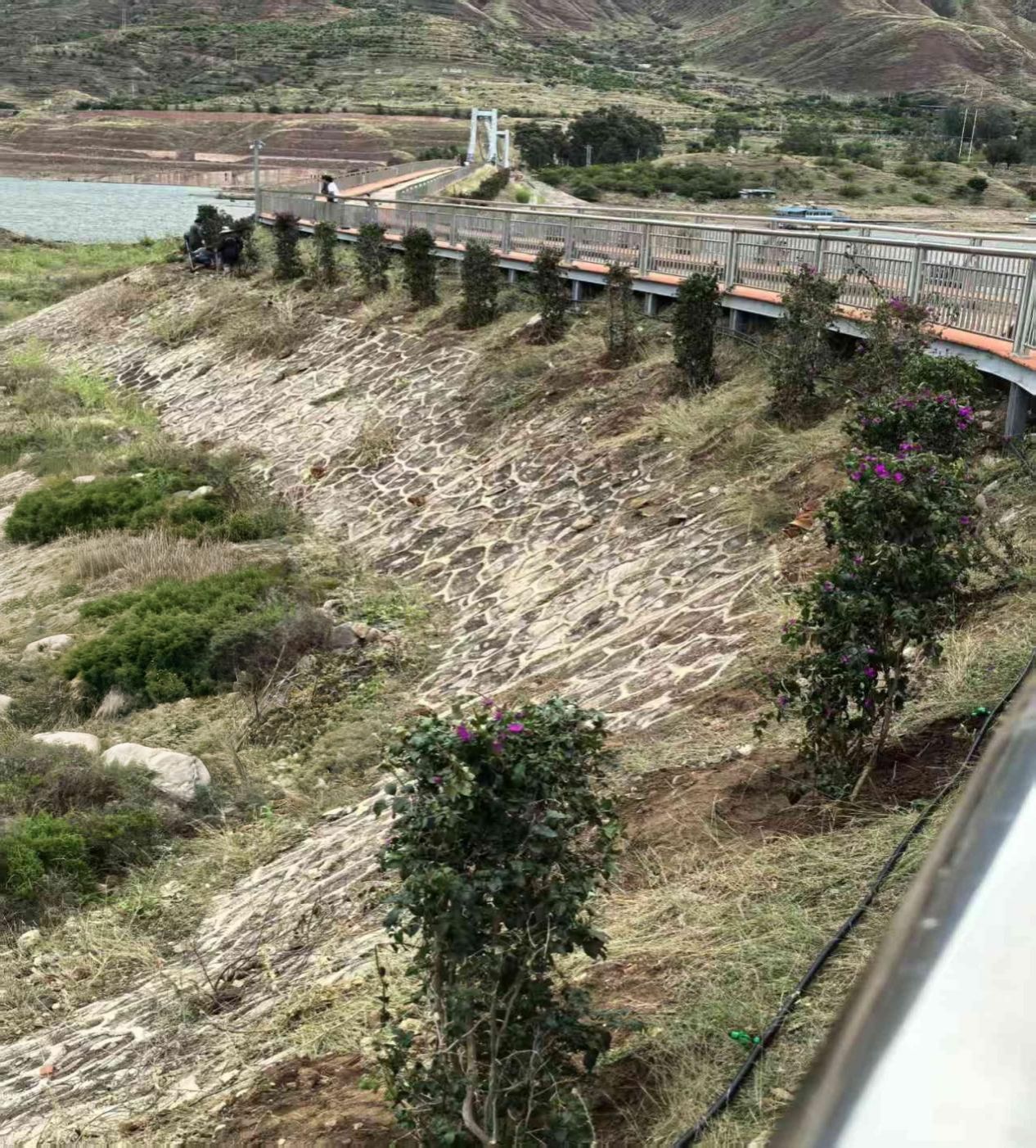 立足干热河谷气候与库区实际,县搬迁安置办积极争取资金60.3万元,因地制宜种植扁轴木、菠萝蜜、三角梅等耐旱耐瘠、固土护坡的特色植物,构建生态防护与岸线美化相融的绿色廊道。同步配套建设滴灌系统、供电线路、抽水泵等一体化设施,实现精准灌溉、智能供水、长效管护,有效破解苗木成活与水土保持难题,让消落区从裸露岸线变为生机盎然的生态岸线。