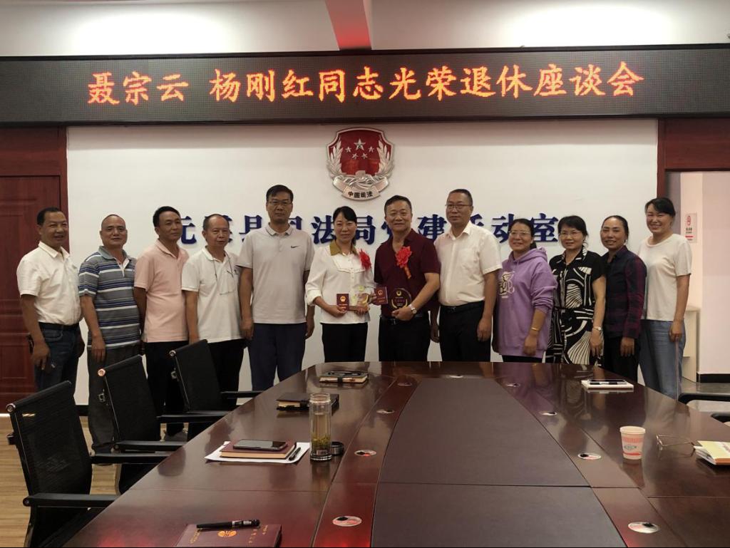 来时风华正茂,归时已生华发。10月28日下午,元谋县司法局举行了简单而又温馨的干部光荣退休座谈会,以最真挚的情谊欢送聂宗云、杨刚红两位同志光荣退休。局领导班子成员、各股室(中心、处)负责人参加座谈会。