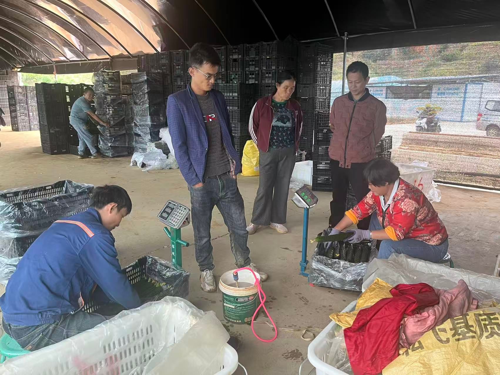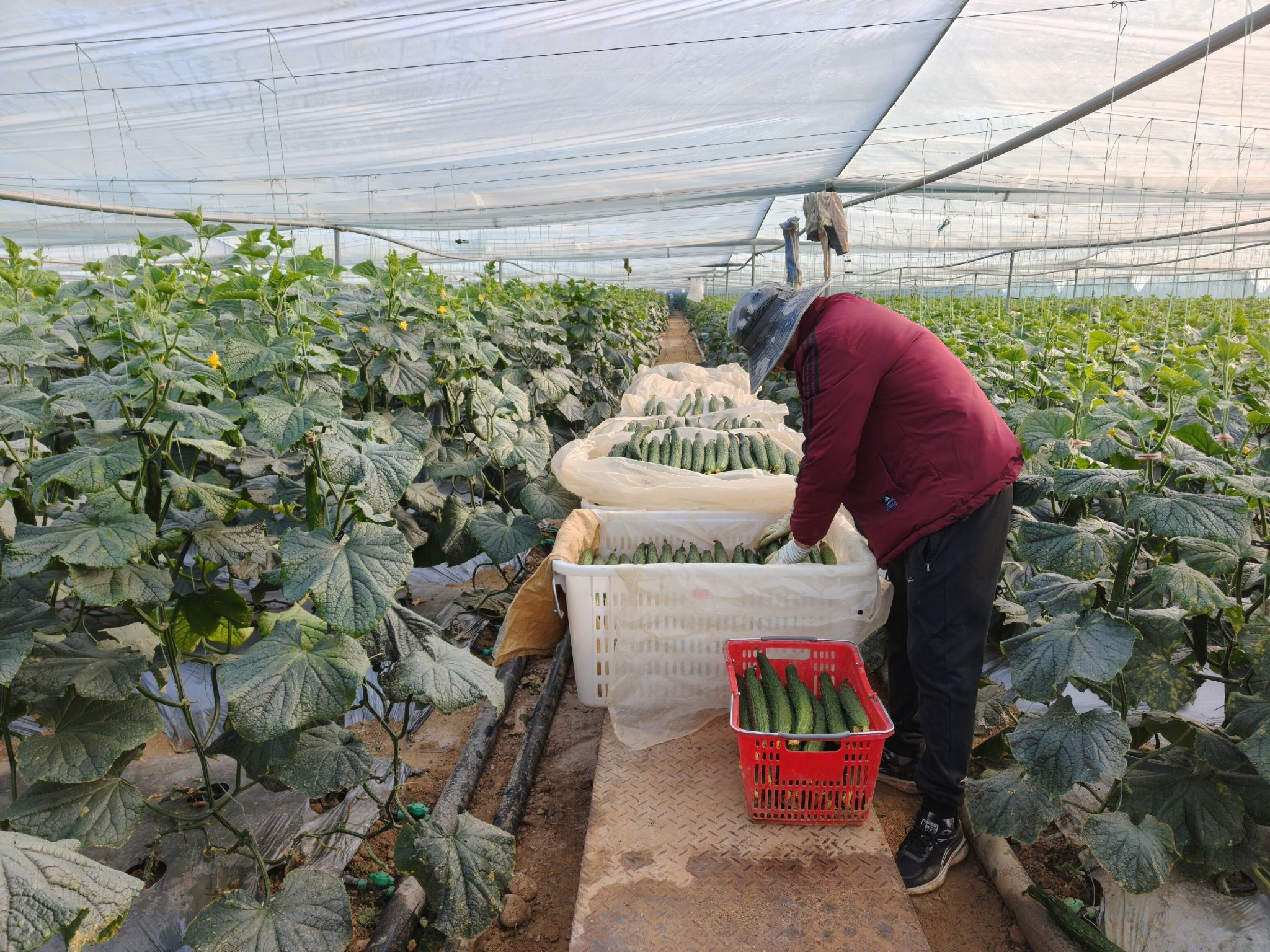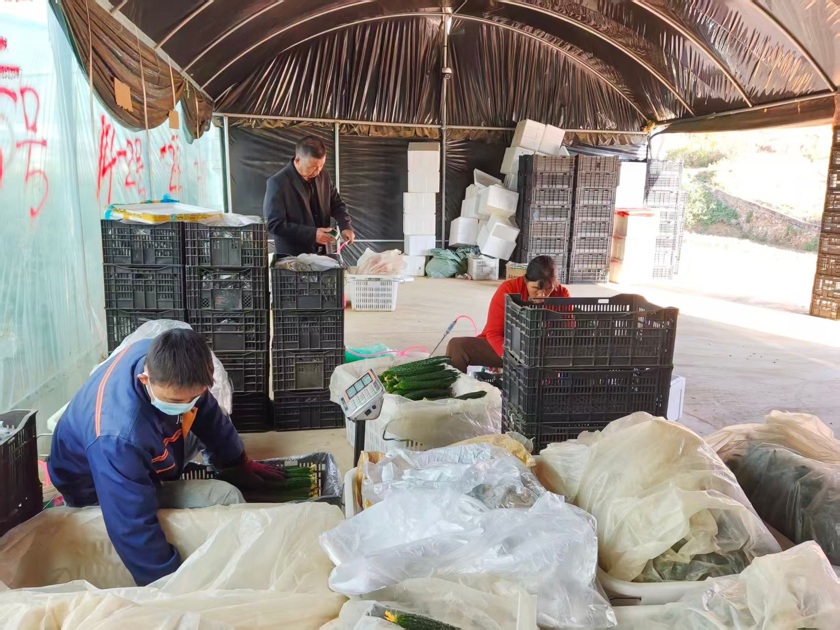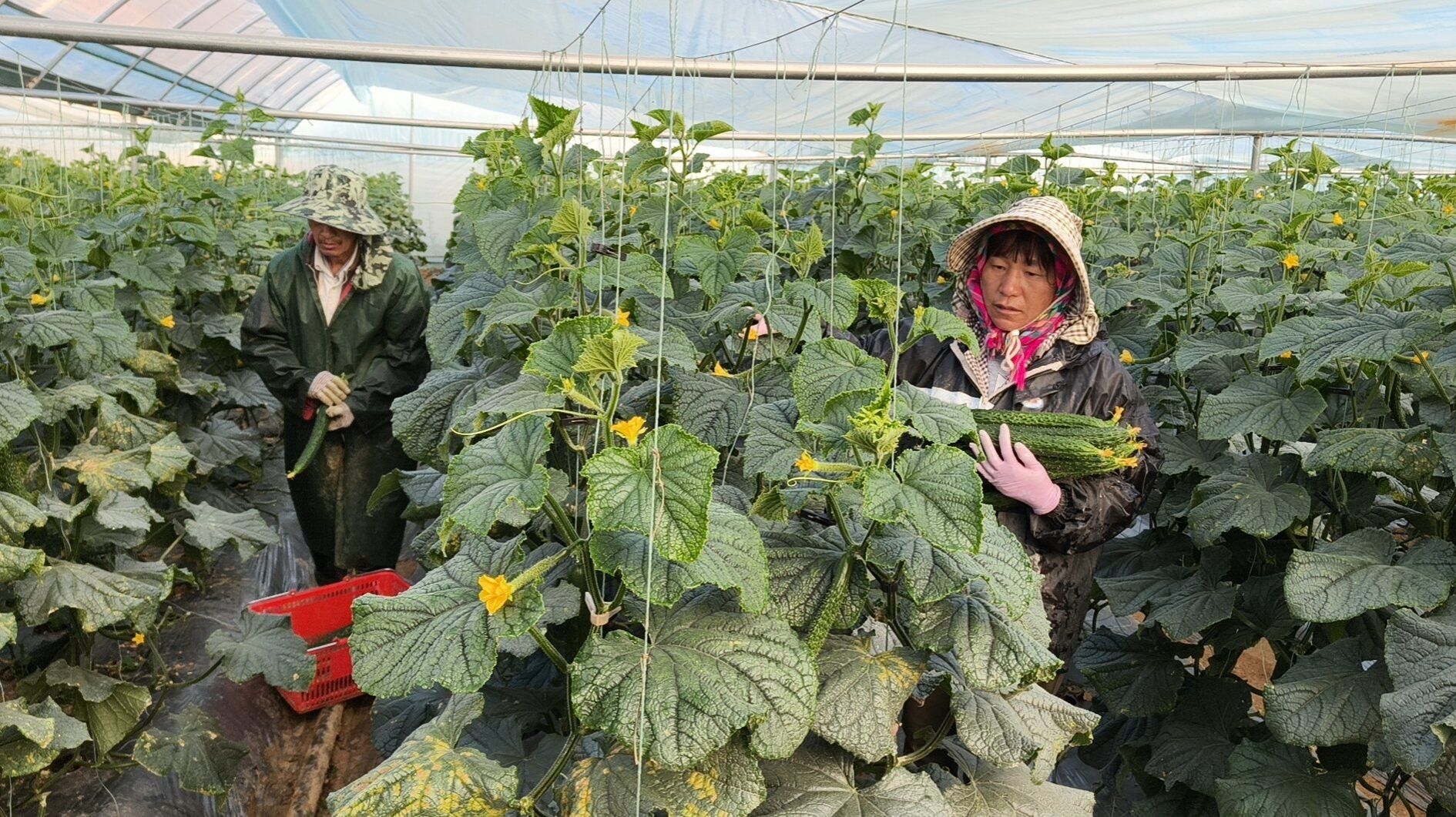 走进黄瓜种植基地,藤蔓攀架,大大、小小、翠绿的黄瓜挂满藤架。村民们手持剪刀,穿梭在藤蔓间,娴熟地采摘、分拣,运输、装箱等环节有序推进,田间地头一派繁忙景象,欢声笑语在大棚里回荡。