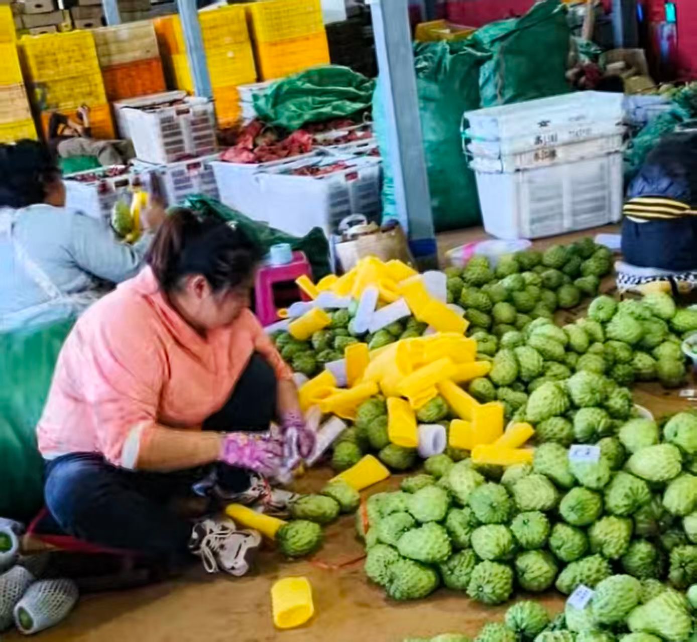 每年1至3月,是丙桂村释迦果成熟上市的黄金季节,也是村民们最忙碌、最幸福的时候。田间地头,采摘的欢声笑语此起彼伏;村里的收购点,两位长期驻扎的老板忙着收购,分拣、装车,一派繁忙景象。为了卖到更高的价钱,有的村民也会自己驾车,把新鲜的释迦果拉到元马镇能禹蔬菜交易市场售卖;罗建波则另辟蹊径,对接外地经销商让丙桂村的释迦果通过合作商直销到全国各地。为了应对市场价格波动,他还建起了冷库,将释迦果冷藏保鲜,待价格回升时再出售,为村民们的收入上了“双保险”。今年,丙桂村的释迦果均价稳定在10至20元一公斤,优质果更是卖到20多元一公斤,实实在在的收益装进了村民的腰包。