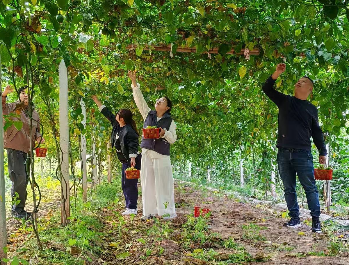 在百香果采摘园里,游客正在采摘百香果。“工作之余来果园采摘,闻着百香果的清香,现场品尝清甜多汁,还能带回家加蜂蜜泡水,体验感特别好,心情也格外舒畅。”采摘的游客说。