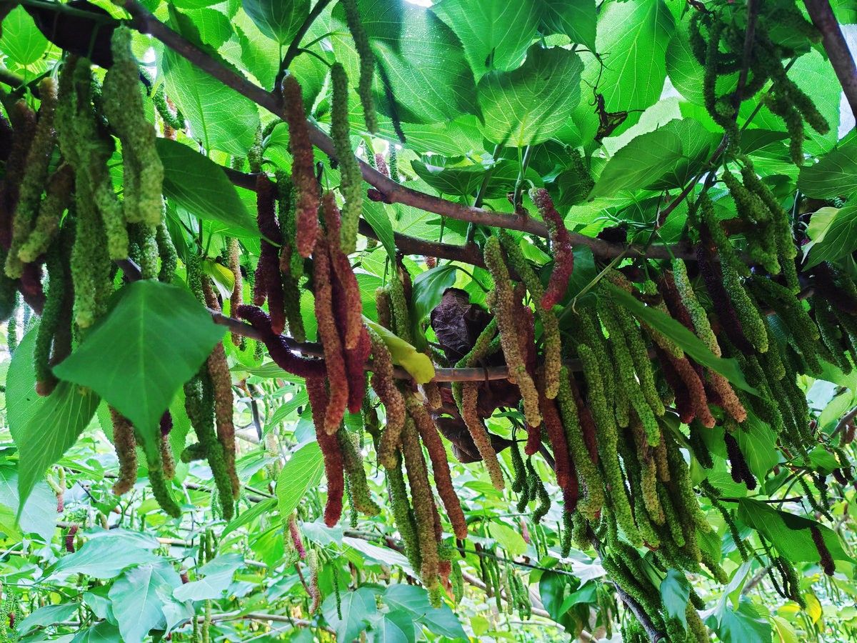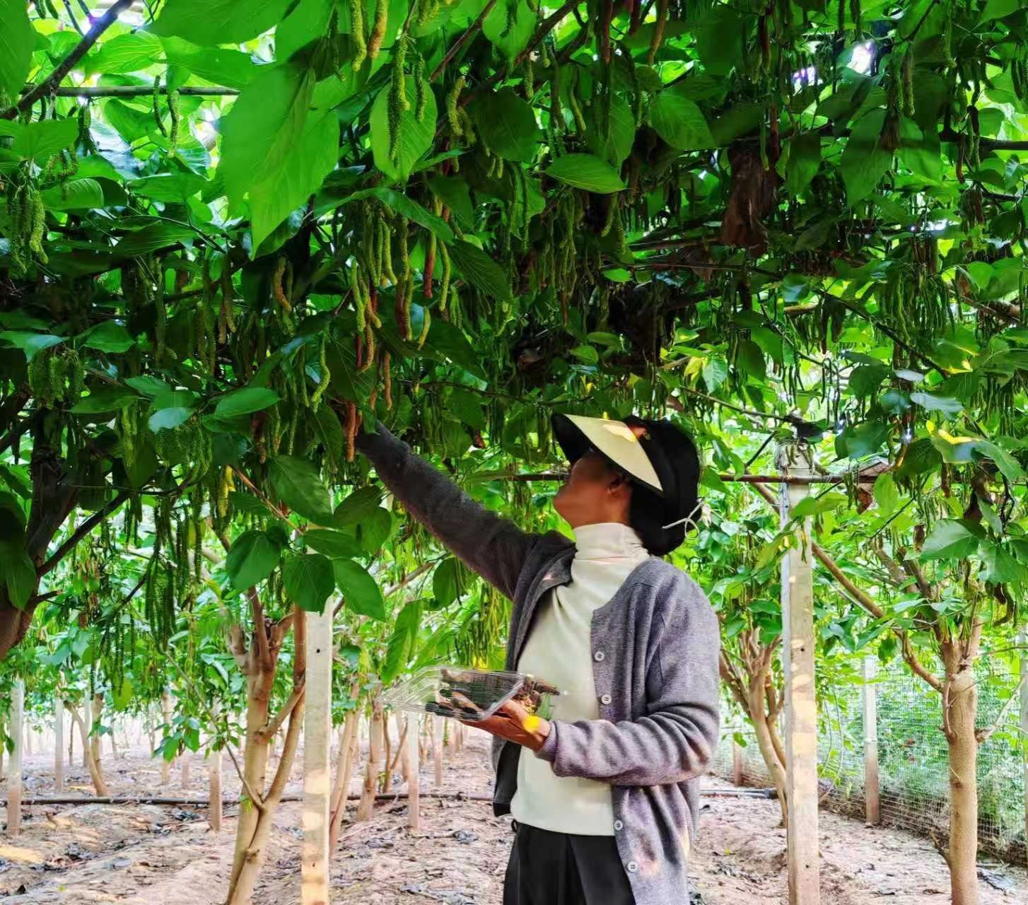 采摘园园主董加仙介绍,自家种植了4.5亩桑葚,有奶油马桑和黑珍珠两种品种,“黑珍珠果肉紧实,适合泡酒;奶油马桑口感清甜,深受游客喜爱。”除了桑葚,园里还种植了百香果,百香果采摘期从每年10月持续到次年5月,桑葚采摘期则集中在3至5月,形成了“四季有果、季季有景”的采摘格局。“平时来采摘的人挺多,高峰期一天收入能有两三千元,少的时候也有几百元,”园主笑着说,为了丰富游客体验,园区还配套了钓鱼、烧烤等休闲项目,让游客既能摘得开心,也能玩得尽兴。