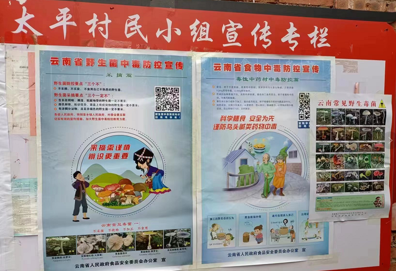 在各村宣传栏张贴野生菌中毒防控宣传海报,通过七彩云端、微信群、QQ群、智能广播等方式多渠道发布、播放食用野生菌中毒防控预警公告及预防食用野生菌中毒的相关语音知识,提醒广大群众不采摘、不加工、不食用有毒野生菌以及如何辨别有毒野生菌、食用野生菌中毒后自救措施等相关知识。