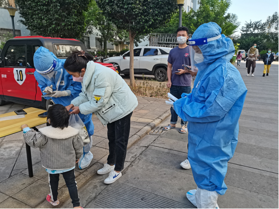 天还没亮,元马镇大沟社区副书记董建玲就已将重点管控区上总括村核酸采样点整理妥当,及时更换破损一米线,穿好防护服,等候大白到来。之后的近6个小时,她身穿“小蓝”忙碌穿梭、协调劝解每一位排队的居民保持间距,同样的言语和动作不知道重复了多少遍,汗水浸湿了防护服,而她心中只有一个念头,就是早日战胜疫情。