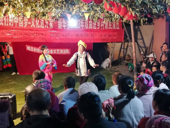 随着一阵欢快的锣鼓声,演出正式拉开帷幕。“唱起来唱起来,送妹送到对门坡...”一曲独具地方特色的草皮调《石榴花开叶子青》以活泼自由的节奏,奔放开阔的旋律隆重开场,回肠荡气的唱腔,观众们仿佛看到了马哥头们在曲折的高山深谷古道上,透过叮咚马铃声和心上人的对唱;一曲《三访亲》,通过生动诙谐的艺术表演形式,讲述了农村家长里短的故事;《新华桃李顶呱呱》《建党精神代代传》等花灯歌舞精彩纷呈,多种形式的表演轮番上阵,演出始终被欢乐沸腾的气氛包围,喝彩声、鼓掌声此起彼伏,社会主义核心价值观活灵活现地融入到文艺作品和表演之中,让观众在演出中感受到了社会主义核心价值观的丰富内涵。“他们每年春节期间都来演出,我们在家门口就能听歌看戏,希望以后这种活动多多开展”。现场观众纷纷表示。