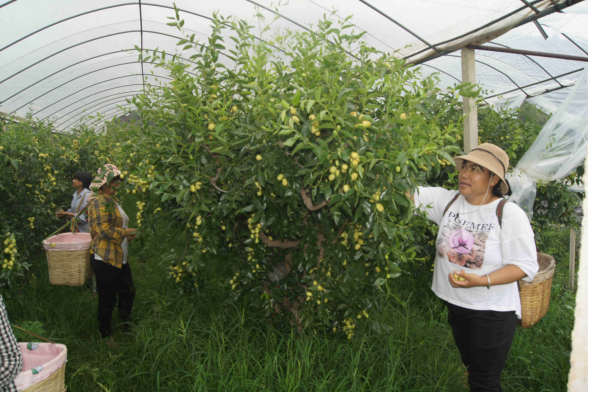 时下正是金丝小枣的采收期,走进云南省元谋县物茂乡洒拉木村金丝小枣大棚,只见一串串青黄泛红的金丝小枣挂在树枝上,随风摇曳中飘来丝丝甜蜜枣香味,沁人心脾,大棚里,姐妹们正忙着采摘金丝小枣,呈现出一派丰收的景象。
