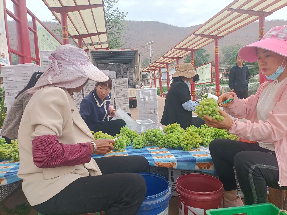 阳春三月末,元谋县老城乡丙月村委会的水晶葡萄最先熟了,在丙岭哨村民小组村口牌坊前,只看见长廊下,果农们喜笑颜开,围坐着给刚采摘的鲜葡萄剪枝、装篮、封箱,为销往全国各大中城市做准备。