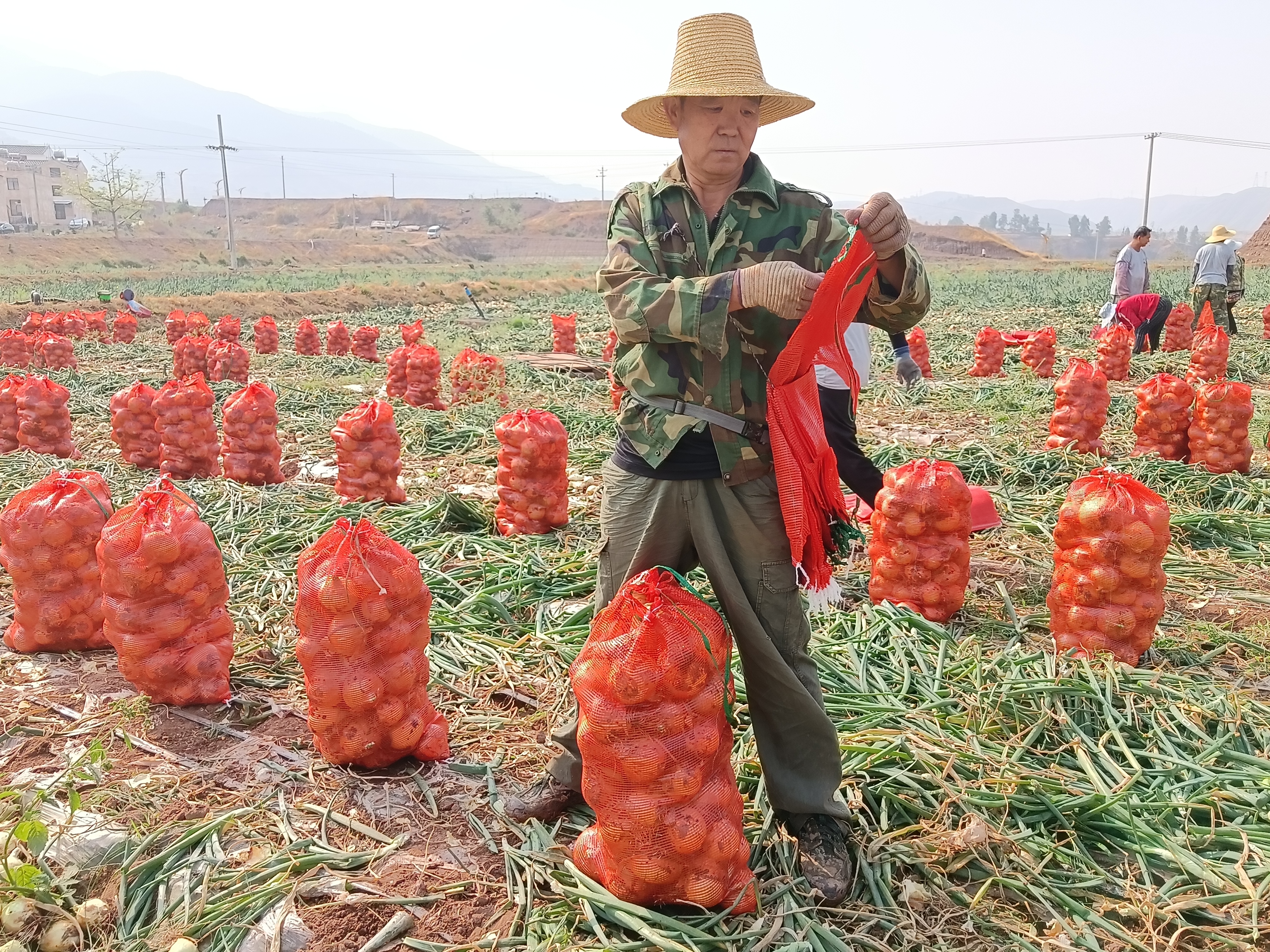 “江边乡自然条件好、土地肥,太适合种植大洋葱啦。今年洋葱价格很好,我在江边种了200亩洋葱,今年产销量都非常可观,每亩地可产280-360袋洋葱,每袋价格35-60元不等。价格好时候一亩地可以卖到1.5万元,我的洋葱主要出口日本、韩国、东南亚国家等,今天销往日本的车已经在能禹市场上等候我们大葱出田运上去啦”,来自甘肃的基地老板苗鹏老板高兴地介绍。