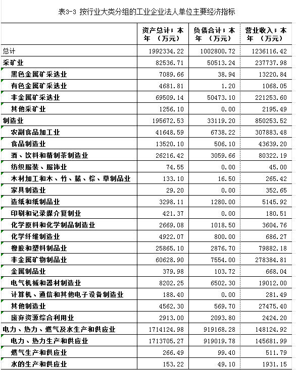 2023年末,工业企业法人单位资产总计1992334.22万元,负债合计1002800.72万元,工业企业法人单位全年实现营业收入1236116.42万元(详见表3-3)。