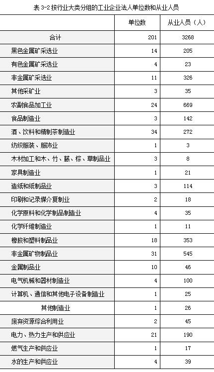 在工业企业法人单位中,采矿业32个,制造业143个,电力、热力、燃气及水生产和供应业26个,分别占15.9%、71.2%和12.9%。(详见表3-1)