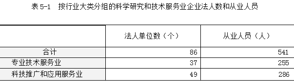 2023年末,全县共有科学研究和技术服务业法人单位96个,从业人员689人,分别比2018年末增长57.4%和76.7%。其中,企业法人单位86个,从业人员541人,分别比2018年末增长65.4%和148.2%(详见表5-1)。