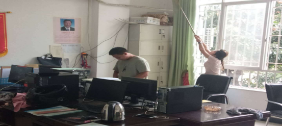 在办公楼清理中,乡机关各办公室、中心、所,严格按照地面无污垢、痰迹、烟蒂、纸屑,办公桌面无灰尘,窗台无灰尘、污迹,办公用品摆放整齐,室内无蛛网、楼道无杂物的要求认真开展整治,切实改善各办公室办公环境。