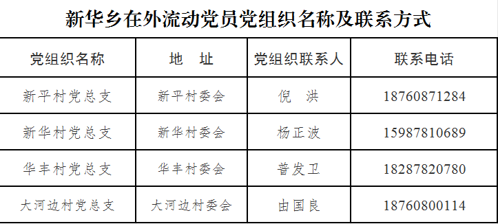 如果您离开新华乡到外地连续工作、学习、生活,且连续6个月以上没有转移正式组织关系、不能参加正式组织关系所在党支部活动,请主动向所在党支部报告外出事由、时间地点、联系方式和外出地党组织名称,配合做好流动党员信息登记,让党组织能够更好地了解您的情况,协调解决您在外地遇到的困难和问题。若具备组织关系转接条件时,请及时联系所在党组织,我们将全心全力为大家做好组织关系转接服务。在此,希望您在外能够展示好自身形象,做好新华代言。