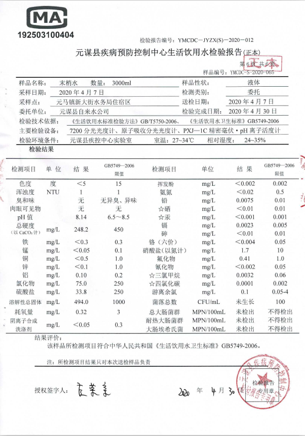 为响应广大人民群众要求,让群众喝上放心水、明白水,并接受社会监督,现将我公司委托元谋县疾病预防控制中心监测检验的2020年4月自来水供水水质检测结果公告如下: