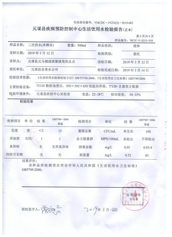 为响应广大人民群众要求,让群众喝上放心水、明白水,并接受社会监督,现将我公司委托元谋县疾病预防控制中心监测检验的2019年3月自来水供水水质检测结果公告如下:
