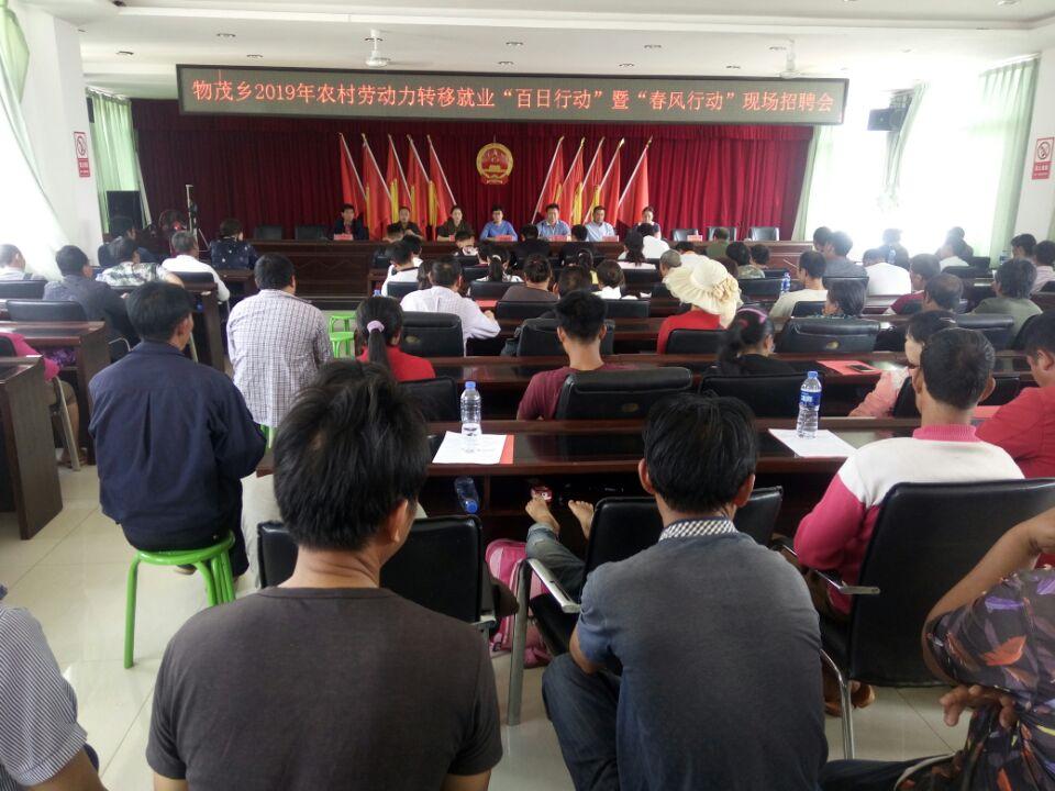 物茂乡本着以“送政策、送岗位、送服务、送技能”的宗旨,为全面贯彻落实党的十九大精神,集中推进农村劳动力,特别是建档立卡贫困家庭劳动力转移就业,于2019年3月8日在乡政府三楼大会议室开展2019年农村劳动力转移就业“百日行动” 暨“春风行动”现场招聘会。