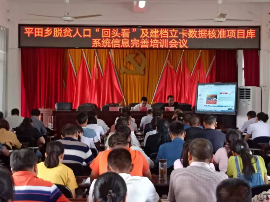 会议对平田乡脱贫人口“回头看”及建档立卡数据核准、项目库系统信息完善等内容开展培训,对近期工作进行安排和部署,要求各村高度重视,对出列村、已脱贫户排查存在问题,查缺补漏、确保脱贫结果真实。