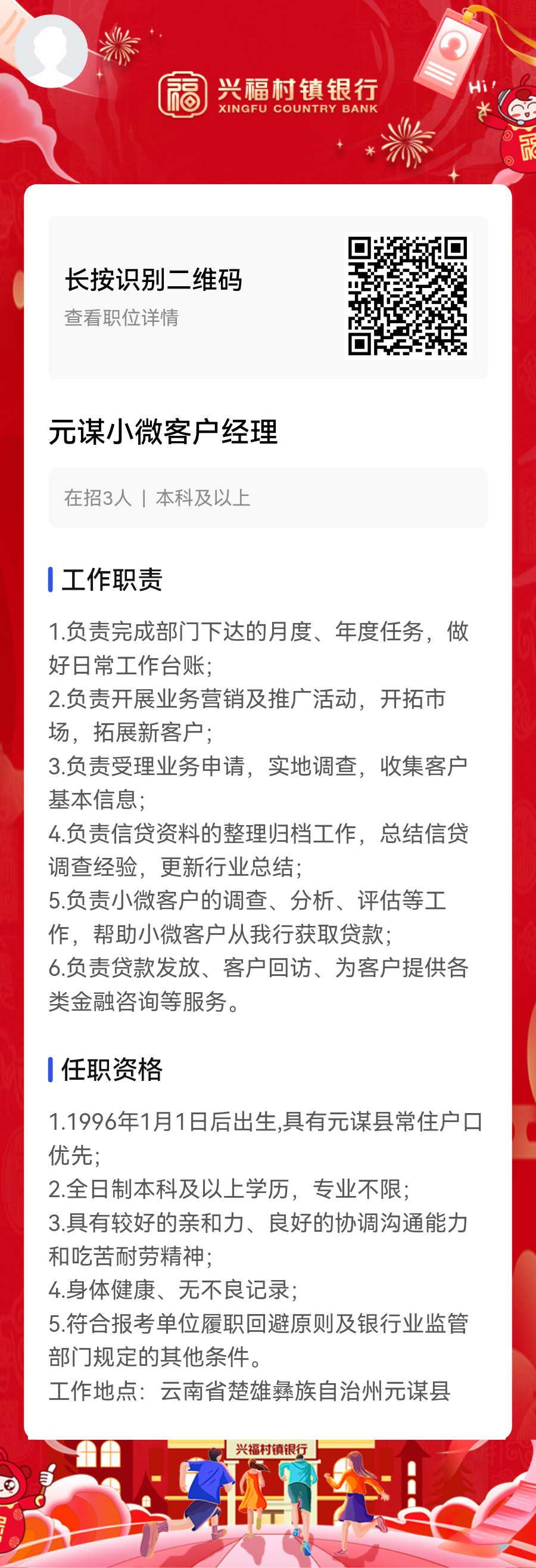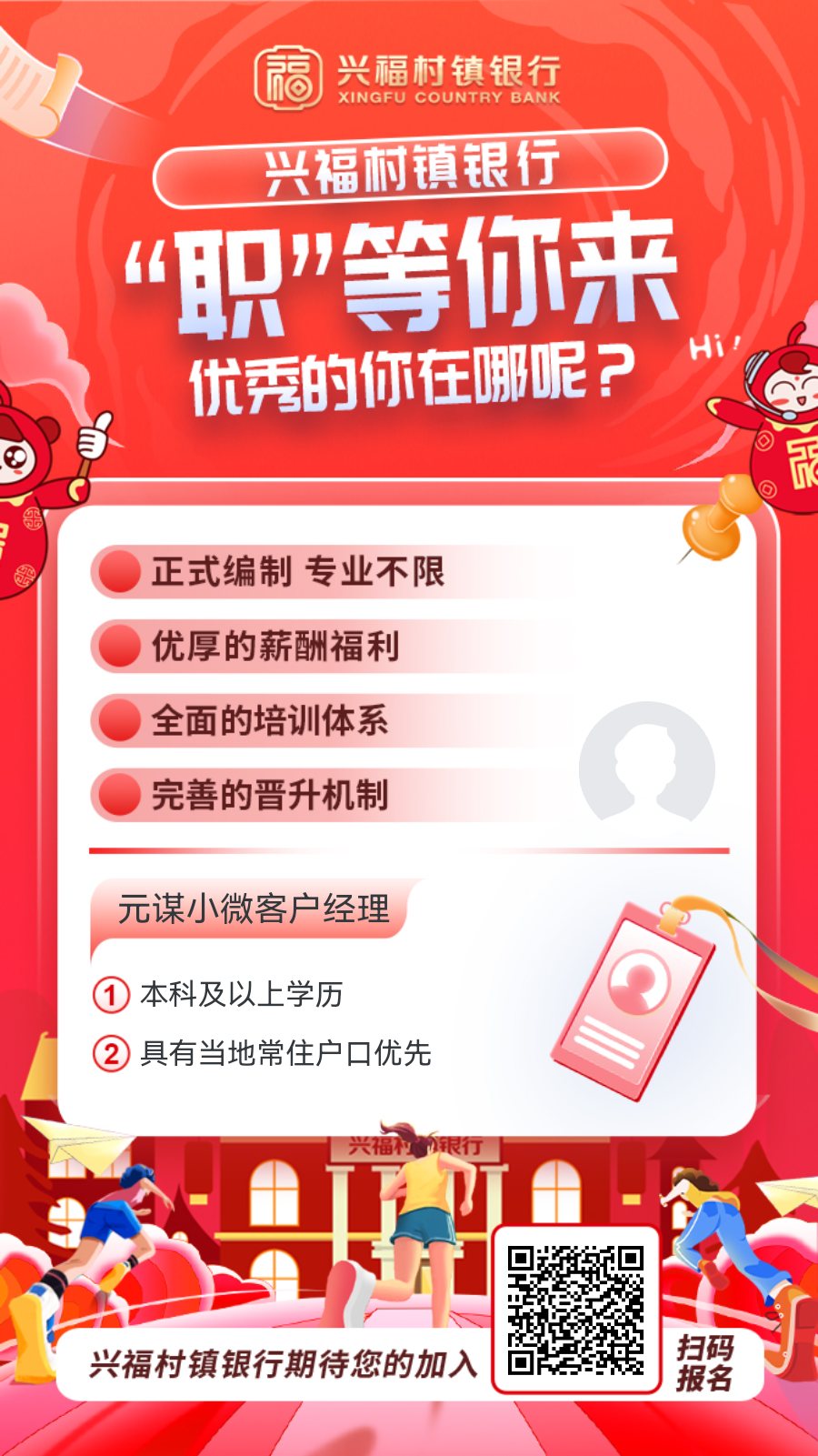 元谋兴福村镇银行是由常熟银行集团旗下的兴福村镇银行股份有限公司主发起并控股的银行业金融机构,经监管部门批准设立,成立于2016年9月20日。发起行兴福村镇银行注册于海南海口,注册资本20.8亿元人民币,作为全国首家投资管理型村镇银行,承担着管理兴福号村镇银行的责任和新设、并购村镇银行的使命,目前下辖江苏、广东、湖北、河南、云南34家法人机构;集团公司常熟农商银行更是入选全球银行品牌价值和全球干强银行"双五百强"!现因业务发展需要元谋兴福村镇银行诚聘以下英才加盟,一经录用,将为您提供充分实现自我价值的舞台和持续发展的空间。