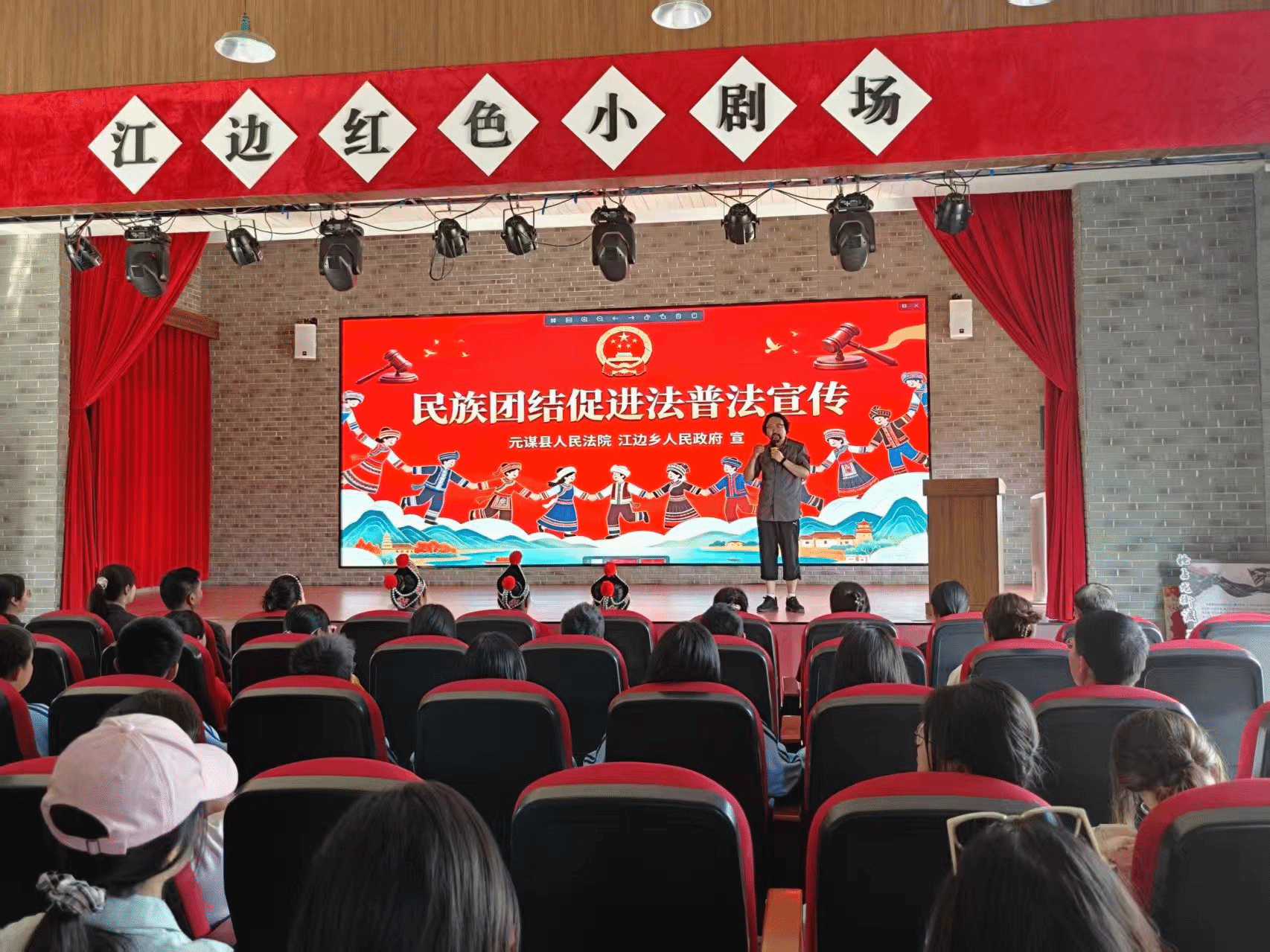 利用江边乡红色小剧场,聚焦群众法治需求,设立法律咨询台、开展现场互动问答,普及党的民族理论政策及基层社会治理相关法律法规。针对青少年,开展民族团结法治主题班会、法治讲座、知识竞赛、文艺表演等活动,将民族政策、法治教育融入校园文化,培养青少年民族团结意识和法治观念。针对各族群众,在村党群服务中心、法治文化广场、农家书屋、新时代文明实践站等阵地,设立民族团结普法角,让群众在日常中接受法治熏陶。
