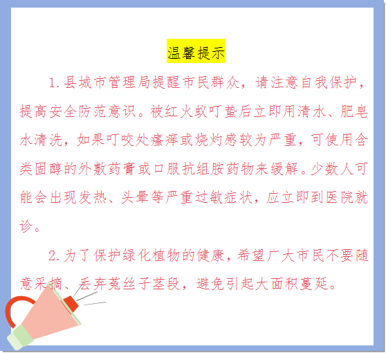 为了有效防治外来入侵物种,县城管局组织绿化养护企业对建成区开展了一次除“菟丝子”灭“红火蚁”专项行动。