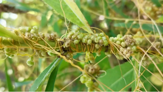 菟丝子又名无娘藤、无根藤、无根草,“橙黄丝儿草上缠,亦非金属亦非棉”,它是一种寄生有害植物,花卉苗木受害时,枝条被缠绕而产生缢痕,菟丝子的吸盘乘势在缢痕上生根,吸收植物营养,造成树势衰落,影响观赏效果,严重时还会造成嫩稍和全株枯死。