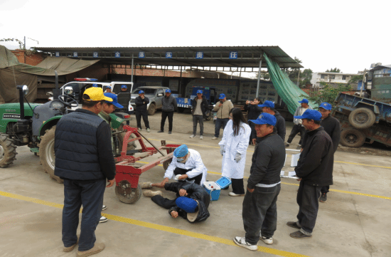 演练模拟三友农机培训学校在组织学员开展拖拉机旋耕作业训练过程中,学员男子张某某在车辆未熄火的状态下,检查并调节旋耕机时,车辆突然熄火,悬空的旋耕机骤然下落而压划伤学员小腿,发生了因操作不当而致人受伤的农机事故。随即启动应急预案应急处置农机事故。