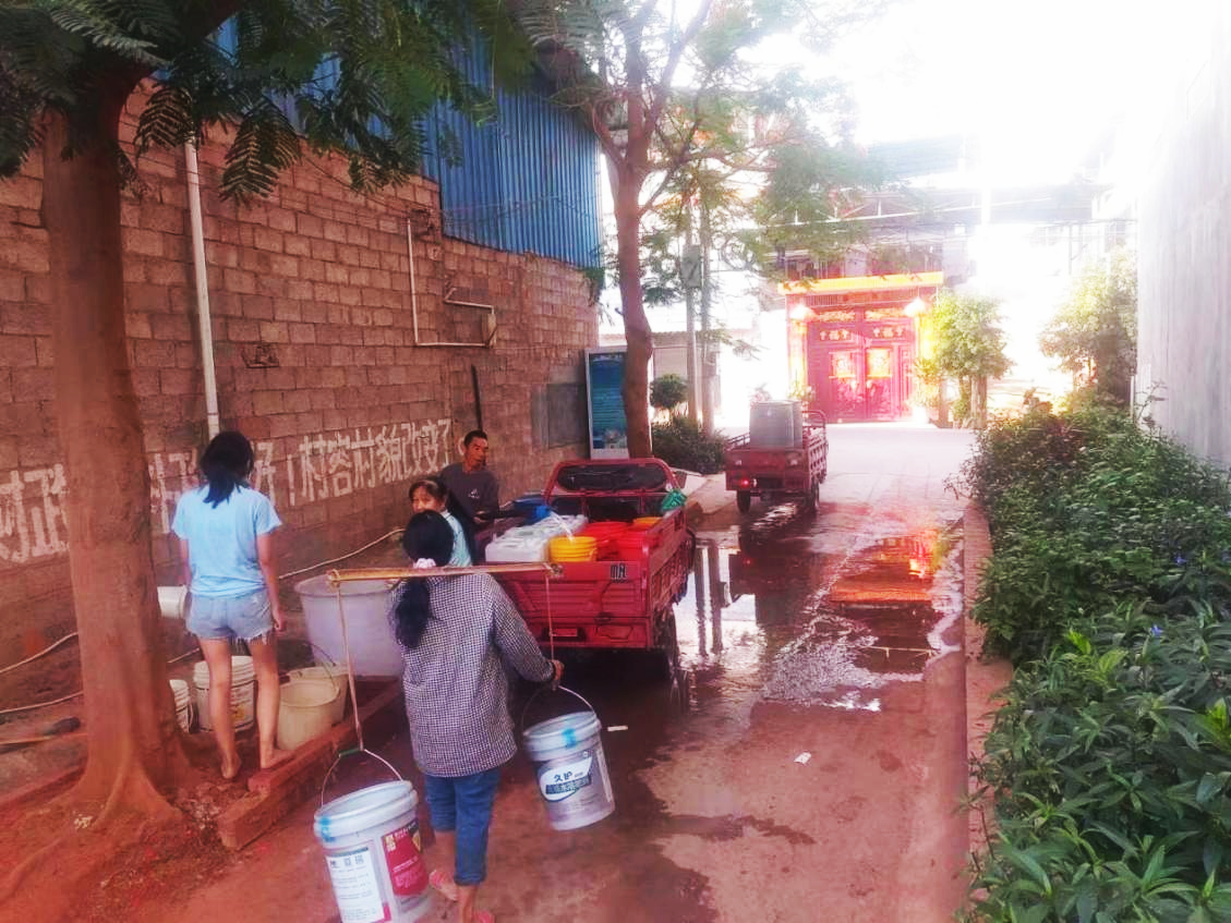 在丙华村委会大丙戌村,大早上就能在村里看到村民们有序排队取水画面,村民的脸上都洋溢着高兴的表情。丙华村委会党总支书记倪文斌介绍“辖区内龙潭水和挨小河水的水资源少,导致住在高处的农户无水使用,需要到村子里拉水挑水使用。村上利用集体经济购买私人的水井里的水资源给村民供水使用。”“还好有村领导的关心,经常向我们宣传节约用水、合理用水,珍惜每一滴水,让每家每户都能有水用。他们用村集体经济购买水源给我们使用,每天在取水处维护秩序,让村民们整齐合理排队取水,使村民能顺利、快速地拉水回家用,不然我们的生活用水都没有,”村民李大姐高兴地说道。