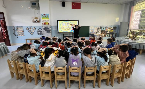 防震应急疏散演练。广播里的地震“预警信号”声响起,老师和小朋友们立刻停止活动,双手护头,降低重心,迅速就近躲到墙角、桌下或支撑结构较多的空间,进行紧急避险。紧接着“紧急疏散”信号响起,幼儿在老师的引导下,用双手保护头部,弯腰低身,小步快走的形式沿着制定的安全路线快速、有序地疏散到室外安全空旷的操场。