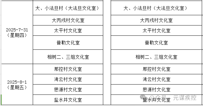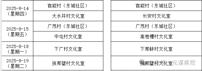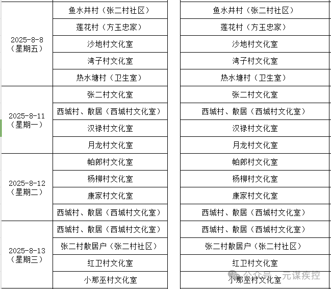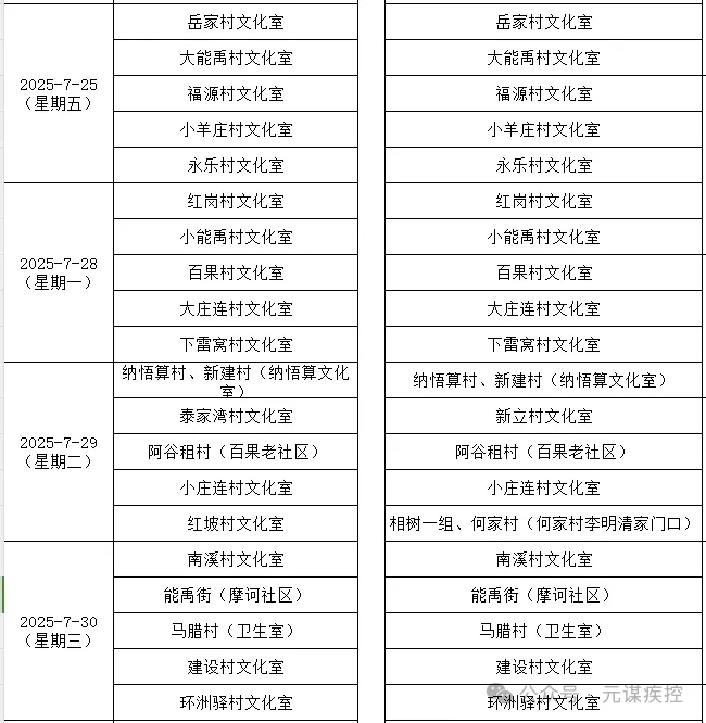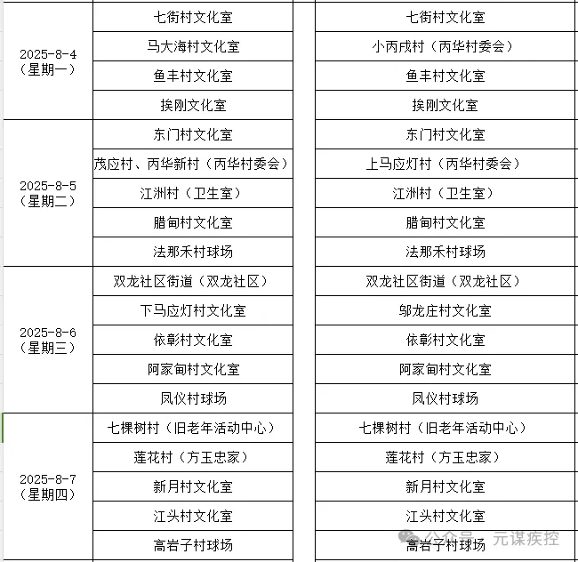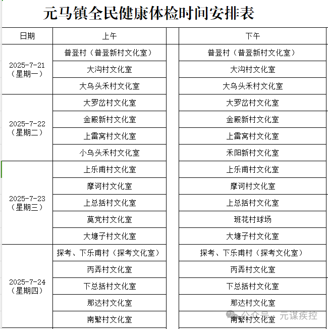 集中体检时间为2025年7月21日—8月19日,按照就近方便群众的原则和各村(居)民小组人口数在村内设置健康体检筛查点半天或一天,具体安排见附表。错过集中体检将另行通知时间自行前往元马镇卫生院补检。(备注:1.周六周天正常休息,不开展体检工作;2.每天上午8点开始体检,若一整天在同一个村子,中午不休息,正常开展体检工作;若上午一个村,下午一个村,体检时间为上午8点至12点,下午2点半至6点)