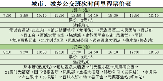 热水塘(起点站)→远达温泉大酒店→时光里小区→凤凰湖公园→21度时光酒店→图书馆报告厅→凤凰郡→金格大酒店→移动公司(发祥路)→水务局→农业银行(发祥路)→西城农贸市场→县工会→元谋客运站(终点站)