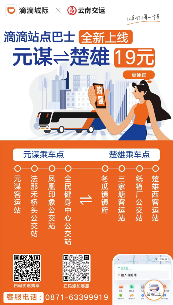 7月1日,由云南昆明交通运输集团有限公司和滴滴出行合作,云南交运、楚交集团、楚雄太阳女集团、楚雄州运司承运的楚雄⇋元谋“站点巴士”定制客运班线正式开通。在试运行期间(7月1日至7月31日),该线路还推出了19元的限时特惠价,给广大群众提供更实惠、便捷、安全的出行选择。