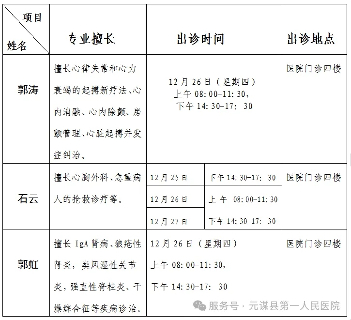 为满足广大人民群众就诊需求,减轻医疗费用负担,让广大人民群众在家门口就能享受到省内外专家的诊疗服务和健康指导,元谋县第一人民医院邀请到了省内外“银龄医师”知名专家到我院坐诊,为广大患者提供优质、高效、便捷的诊疗服务,现将出诊的具体事项通知如下: