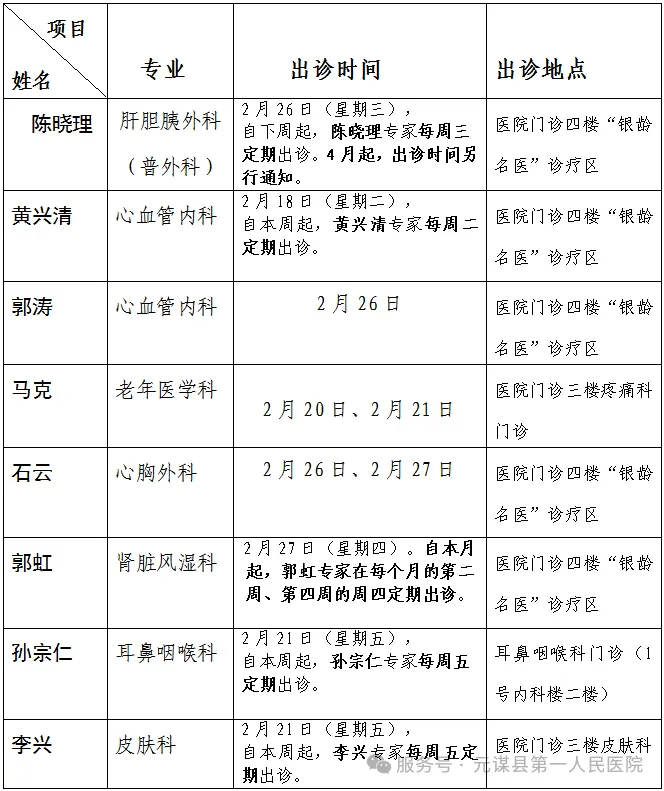 为满足广大人民群众就诊需求,减轻医疗费用负担,让广大人民群众在家门口就能享受到省内外专家的诊疗服务和健康指导,元谋县第一人民医院邀请到了省内外“银龄医师”知名专家定期到我院坐诊,为广大患者提供优质、高效、便捷的诊疗服务,现将出诊的具体事项通知如下: