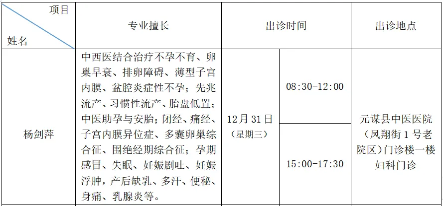 为满足广大人民群众就诊需求,切实减轻医疗费用负担,让广大人民群众在家门口就能享受到省级三甲医院专家优质的诊疗服务和健康指导,元谋县中医医院邀请到省内“银龄医师”知名专家杨剑萍主任医师到我院坐诊,为广大患者提供优质、高效、便捷的诊疗服务,现将出诊的具体事项通知如下: